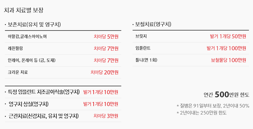 충치예방치료와 충치 치료에 특히 보장이 크며, 보철치료는 20만원, 크라운 치료는 10만원, 치석제거는 1만원, 치과치수치료는 3만원을 보장합니다.