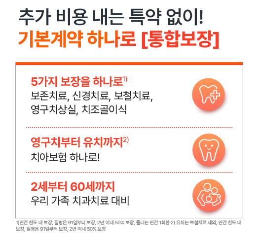 2세부터 60세까지 가입이 가능한 이 보험은 온 가족이 함께 가입하여 대비하기에 좋습니다. 보존치료의 아말감, 글래스아이노머는 5만원, 레진, 인레이, 온레이 등은 7만원, 크라운 치료는 20만원을 보장합니다.
