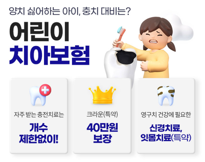 치아 건강과 습관은 어린 시절부터 빠르게 잡는 것이 가장 좋습니다. 특히, 치아는 유전적인 요인이 많이 작용하는 부분으로 아무리 관리를 하더라도 아이가 충치로 고생할 수 있습니다. 어린이는 유치에서부터 영구치까지 치료를 하다보면, 비용이 만만치 않게 드는데요. 어린이 치아보험을 미리 가입해 비용적인 부분에서 많은 도움을 받을 수 있습니다.