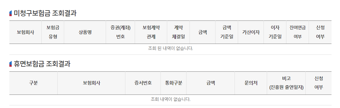 또한, 보험가입내역 조회결과 아래에는 미청구보험금 조회와 휴면보험금 조회 결과를 보여줍니다. 여기서 조회된 보험들은 추후 보험금을 받을 수 있으니 꼭 한번씩 해보시는 것이 좋습니다.